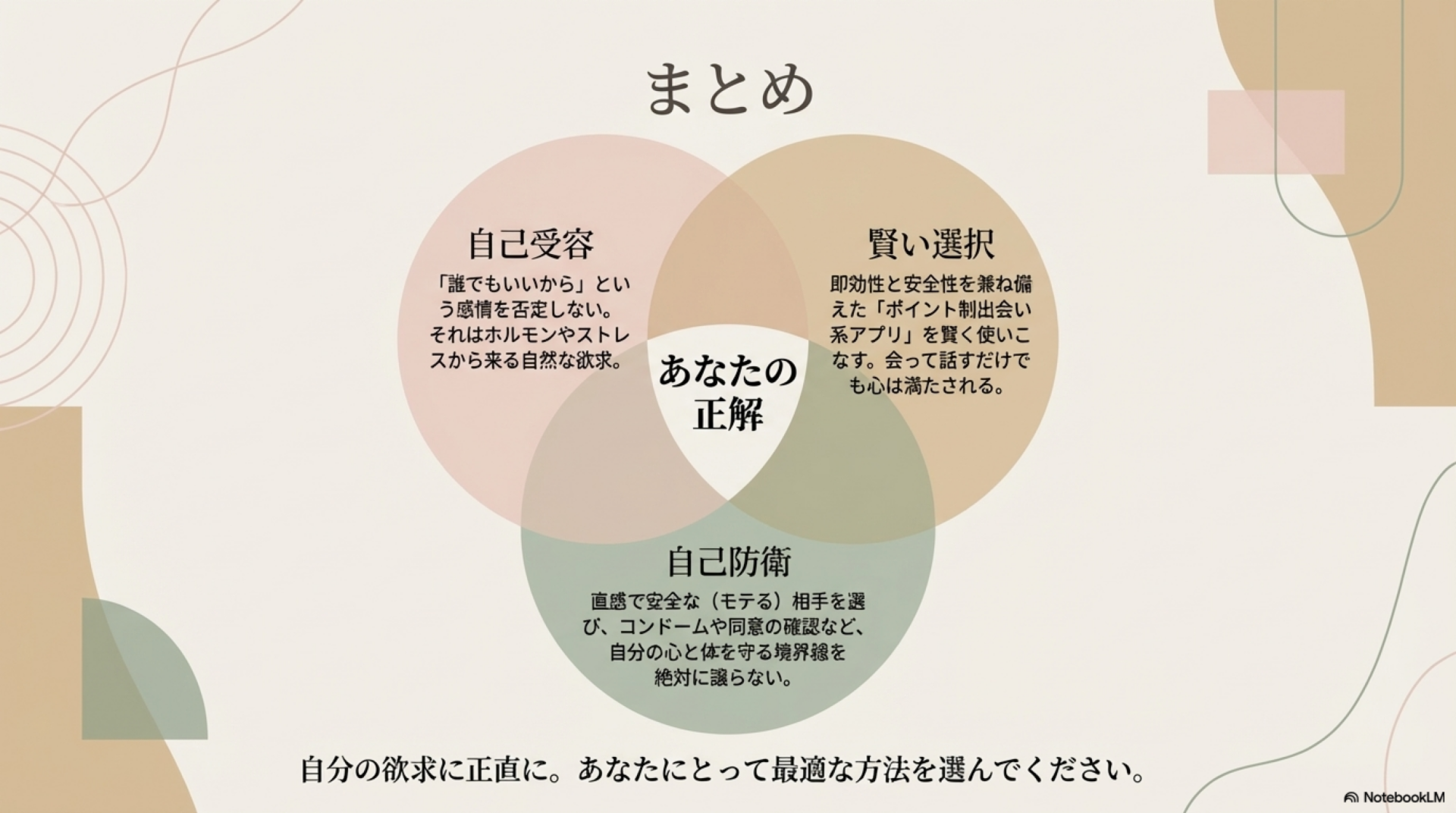 ただし、どんな相手であっても安全対策は必須です。モテる男性を選ぶ、コンドームを必ず使用する、お互いの同意を確認するといった基本的なルールを守ること。そして行動に移すかどうか迷ったときは、一人で解消する方法や友人との時間という選択肢も忘れないでください。