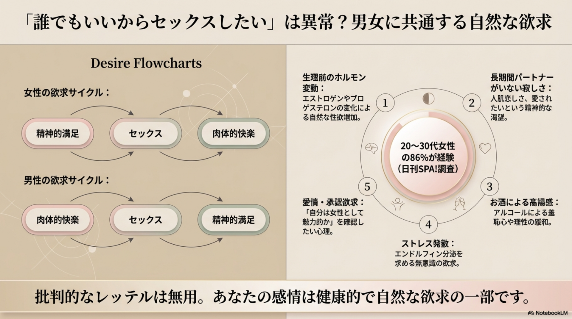 おかしくありません。男性誌の調査では女性の86%が同様の感情を経験していると回答しています。ホルモンの変動や寂しさ、ストレスなど、様々な要因で自然に生じる欲求です。