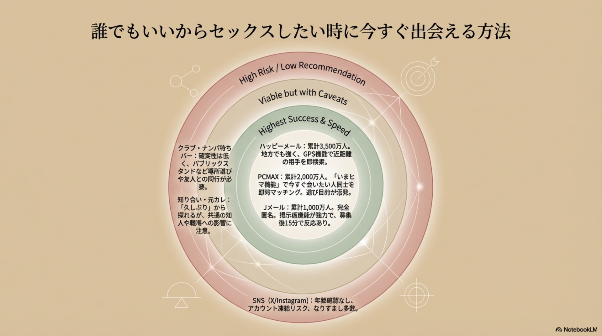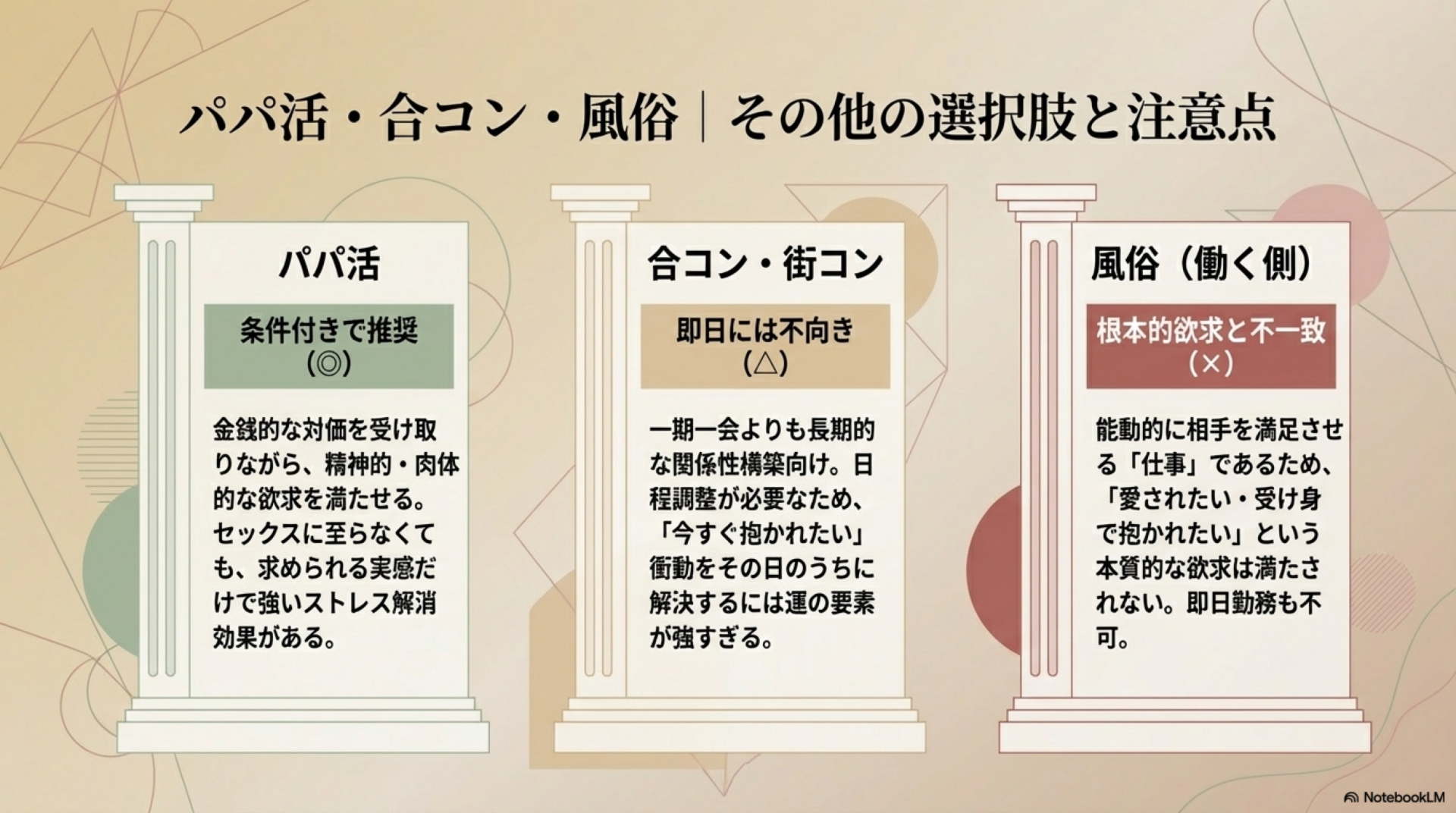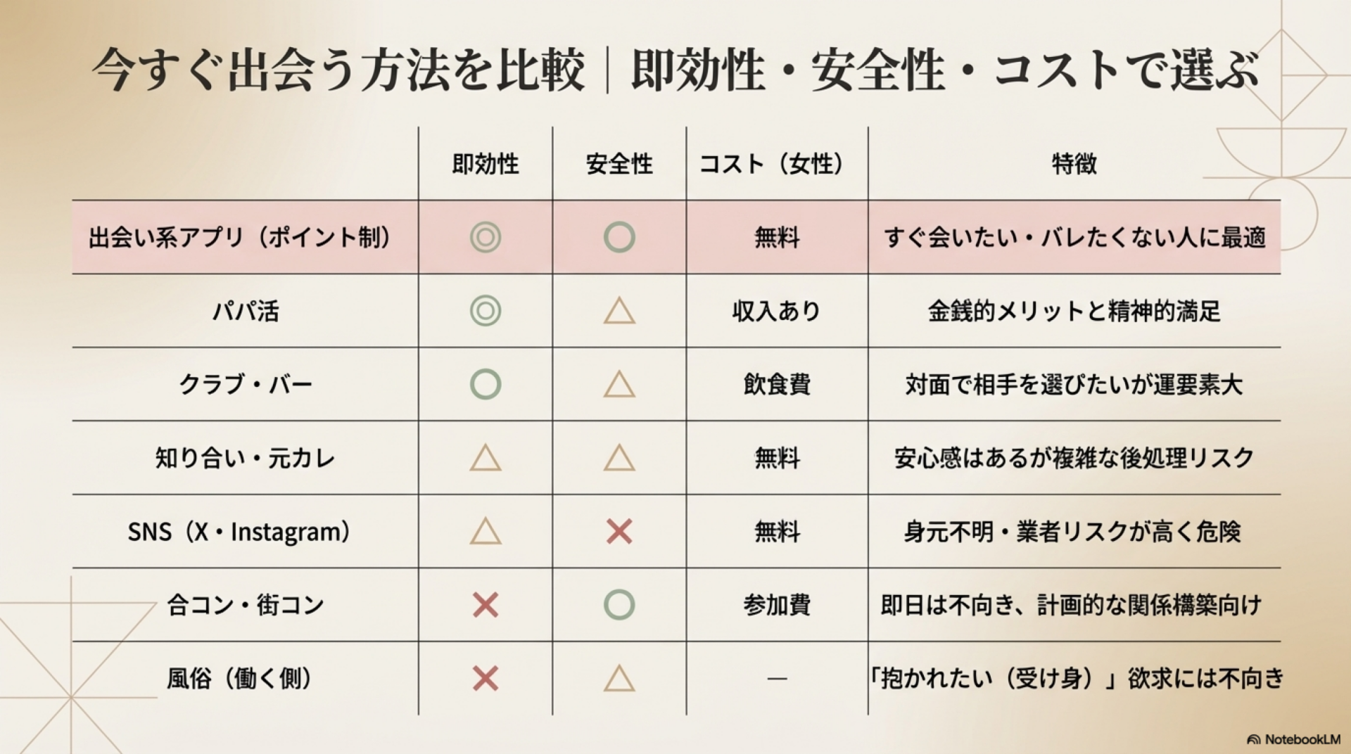 | 風俗(働く側) | × | △ | — | 「抱かれたい」欲求には不向き |