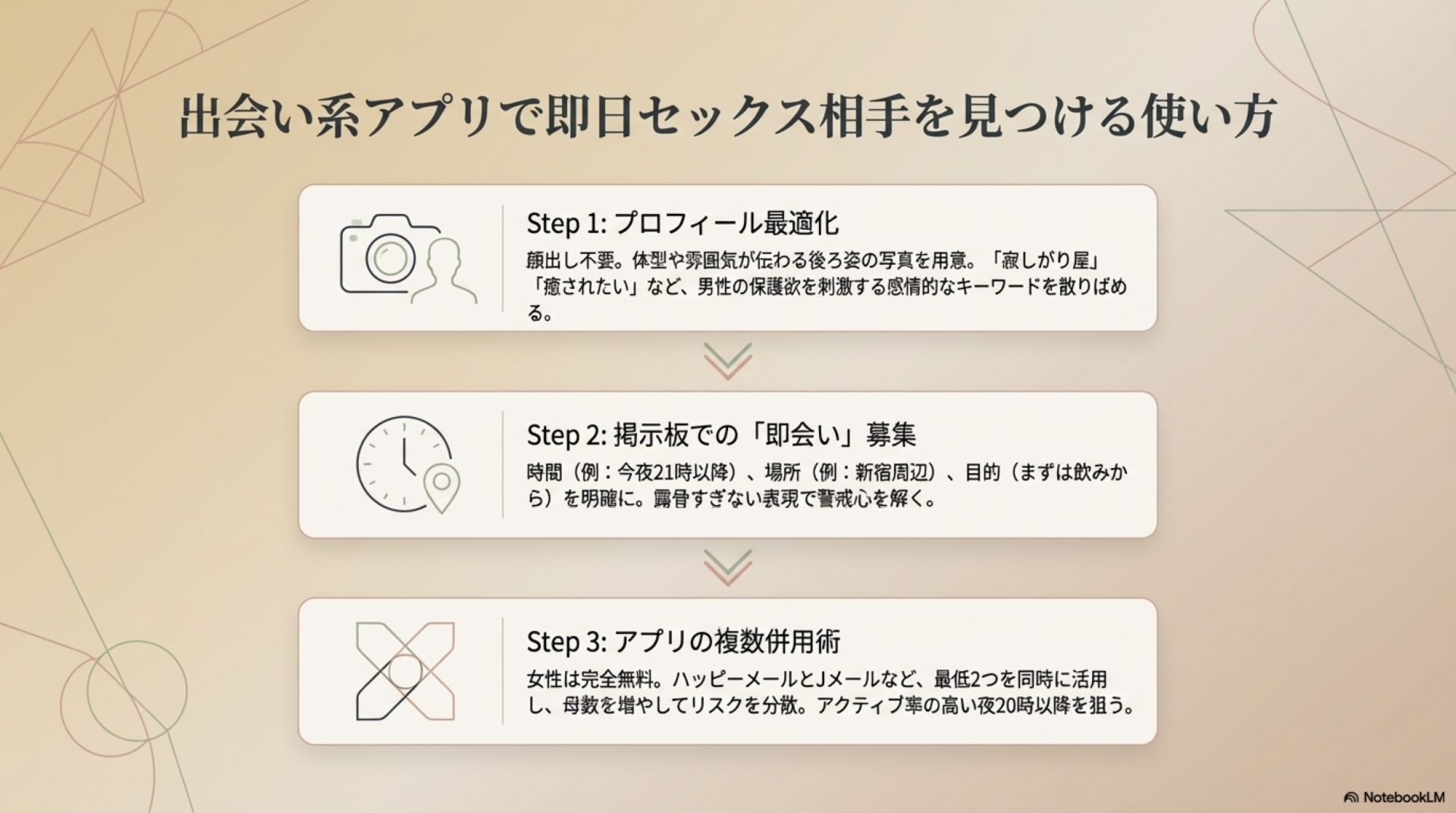最低でも2つのアプリを併用することをおすすめします。特にJメールとハッピーメールの組み合わせは、どちらもアダルト系に寛容で女性無料のため、リスクなく始められます。
