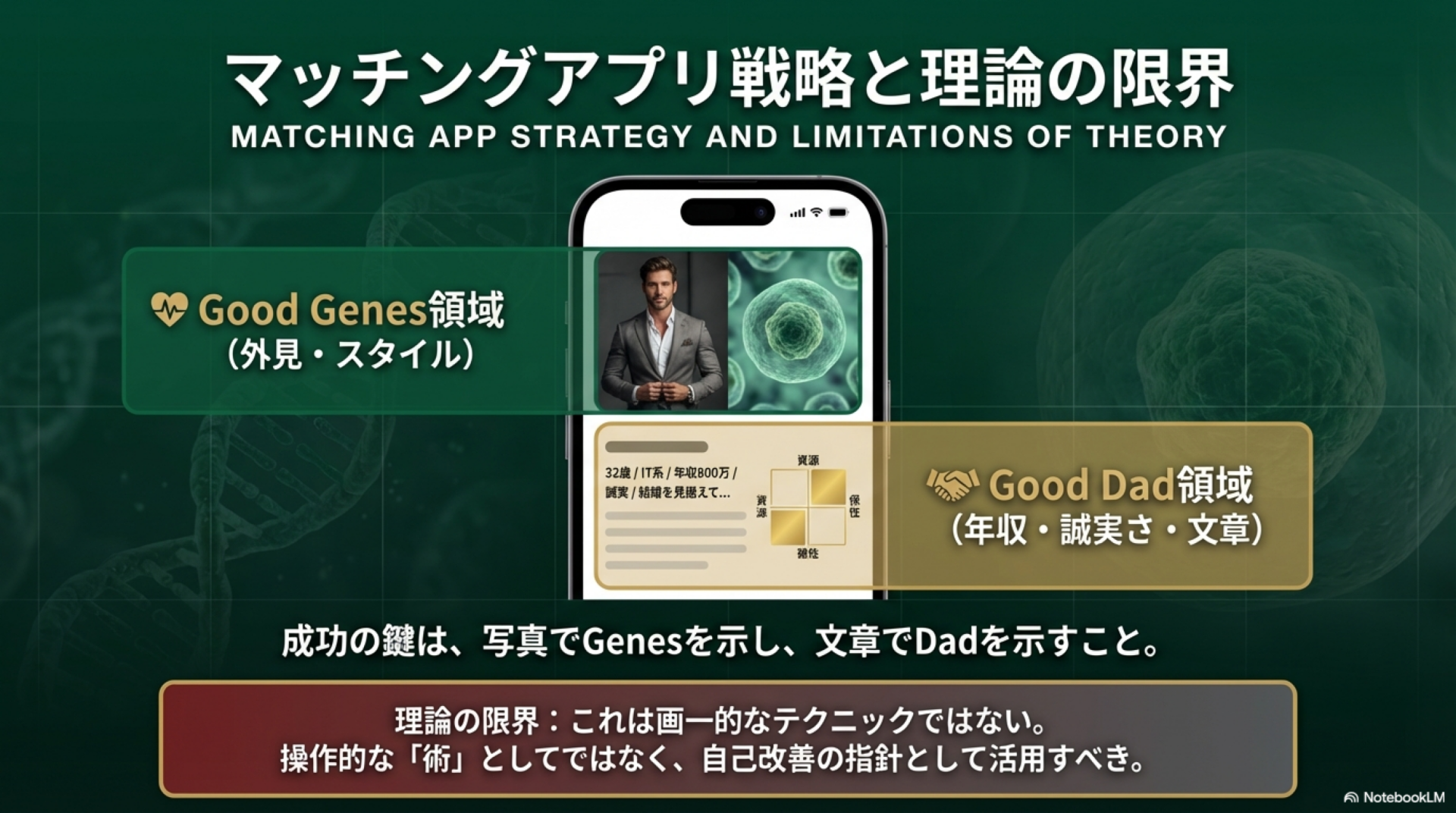写真で「いいね」を獲得するにはGood Genesのシグナルが必要であり、その後のメッセージや実際のデートではGood Dadの要素が関係の発展を左右します。つまり、マッチングアプリで成功するには両方の要素をバランスよく示すことが不可欠です。