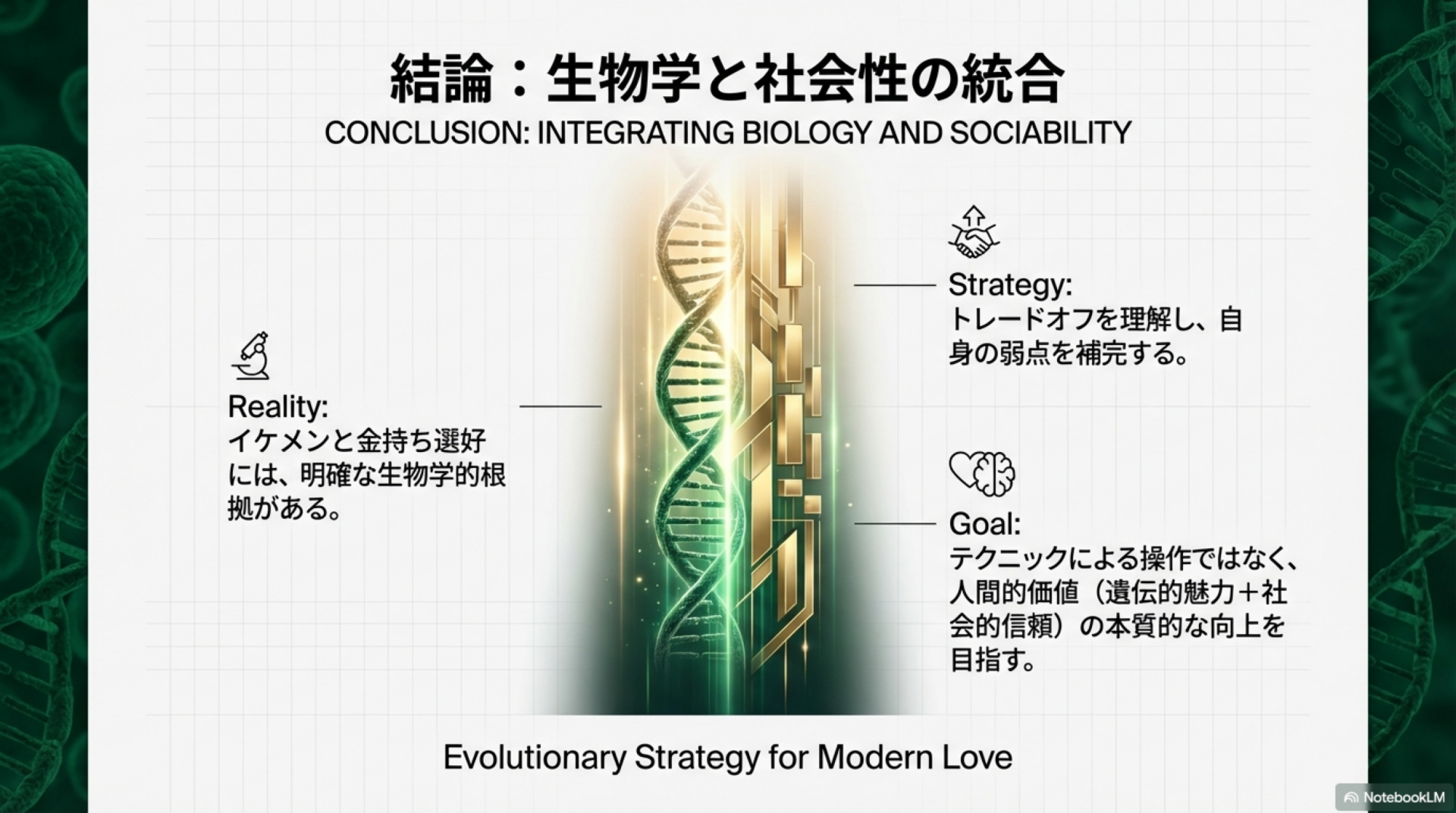 - 進化生物学、心理学、確率論を応用した実践的な恋愛理論