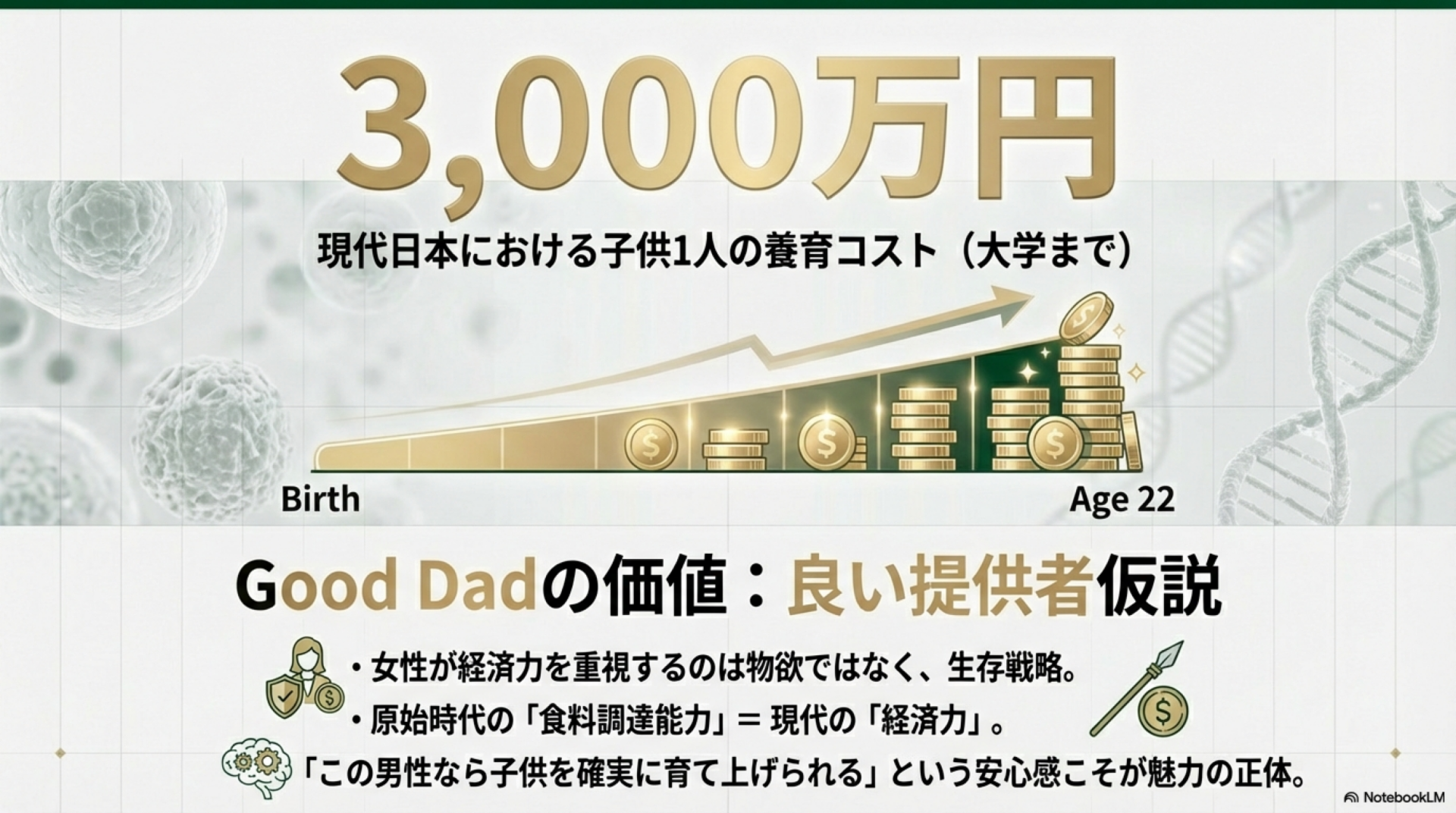 Good Genes Good Dad理論は、金融工学者の藤沢数希氏が自身の著書「恋愛工学」において提唱したフレームワークです。この理論は、女性がなぜ「イケメン」と「金持ち」に魅力を感じるのかを進化心理学の観点から説明しようとするものです。
