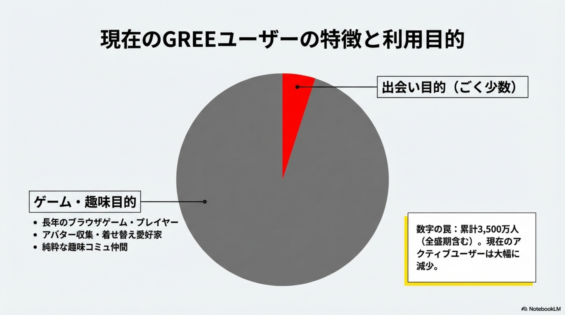 グリーの累計登録者数は約3,500万人とされていますが、これはサービス開始以降の累計値です。現在のアクティブユーザー数は公開されておらず、全盛期(2012年頃のピーク時に約2,700万人の会員数)と比べると、利用者は大幅に減少しています。