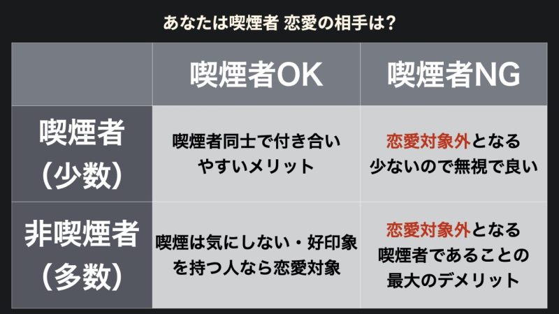 はい、データ上は明らかに不利です。多くのユーザーが検索時に喫煙者を除外し、マッチング率が大幅に低下します。特に**非喫煙者の半数以上が「喫煙者は恋愛対象外」**と回答している調査結果もあります。
