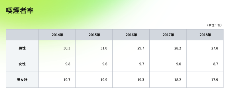 年代別の喫煙傾向では、男性の40代が最も高く33.4%となっていますが、全体的に減少トレンドが続いています。一方で加熱式タバコの普及が急速に進んでおり、喫煙者のうち男性の約40%が加熱式タバコを使用しています。